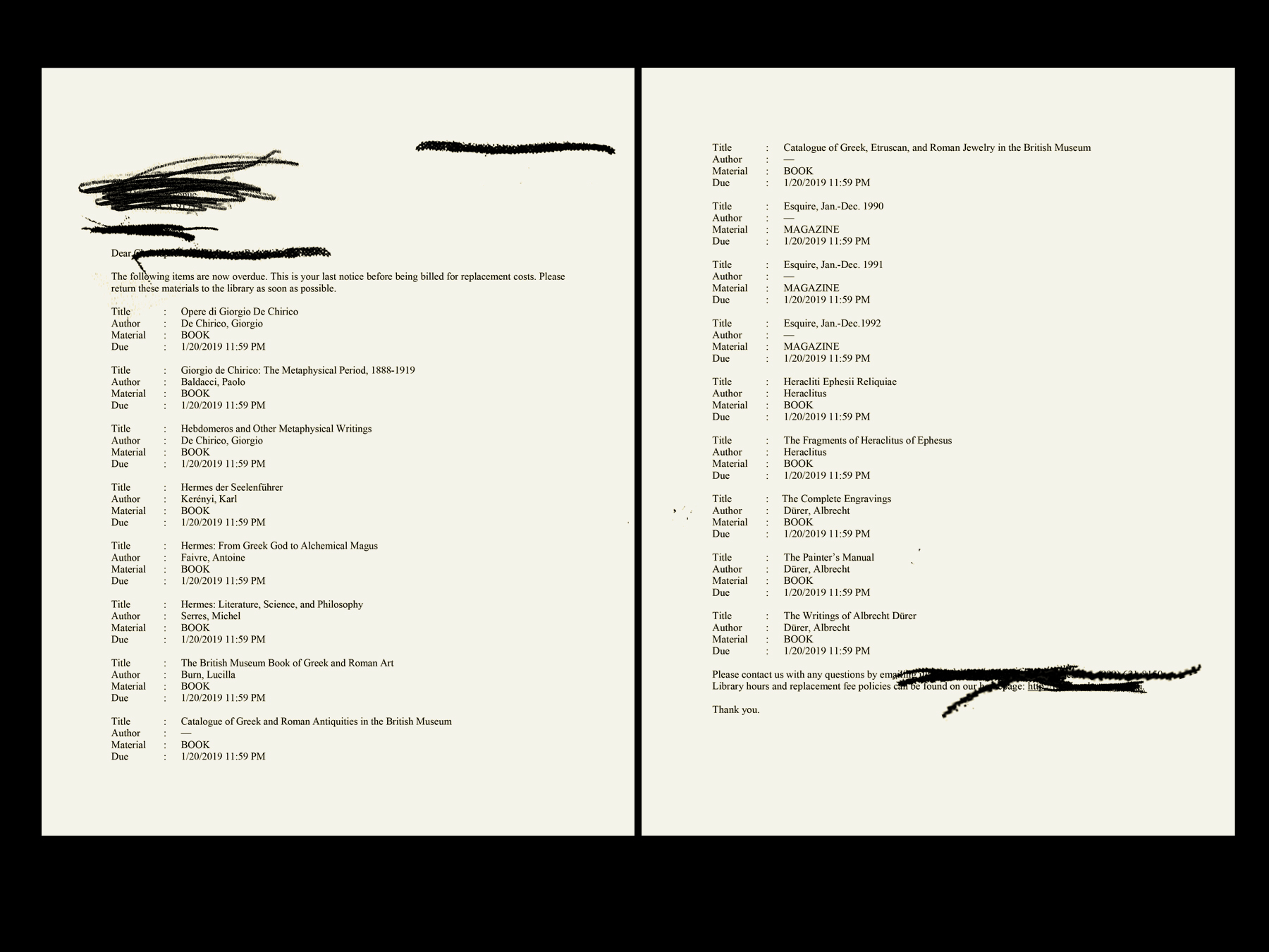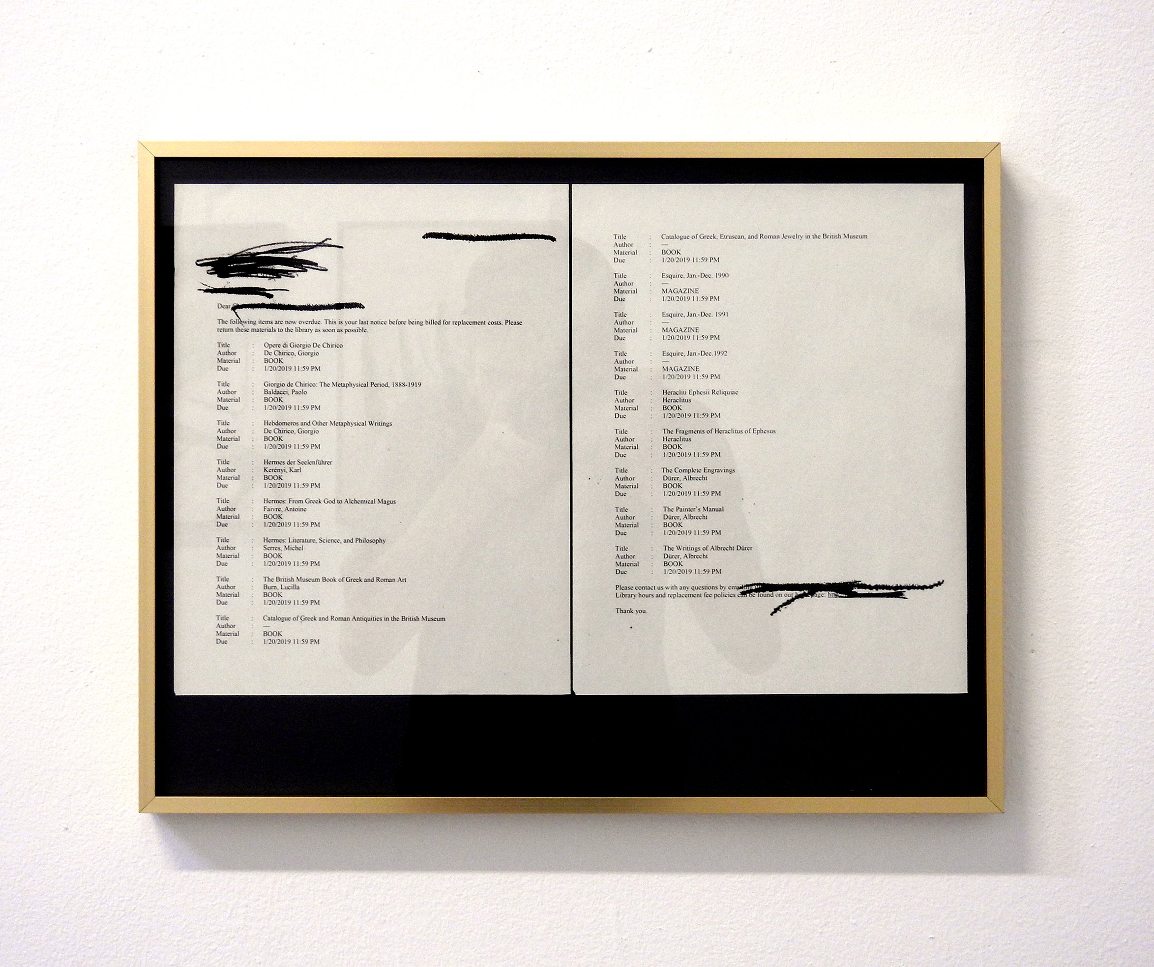 Overdue Notice (2019). Toner on newsprint mounted on board.